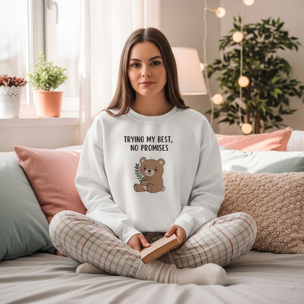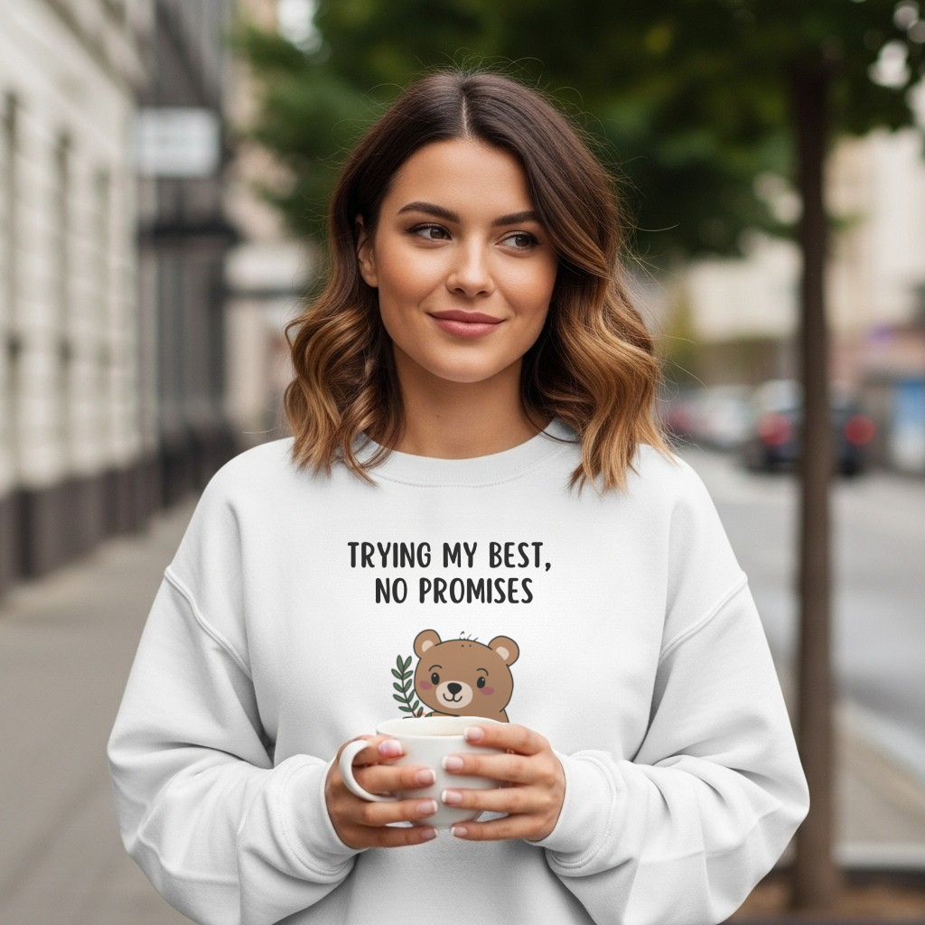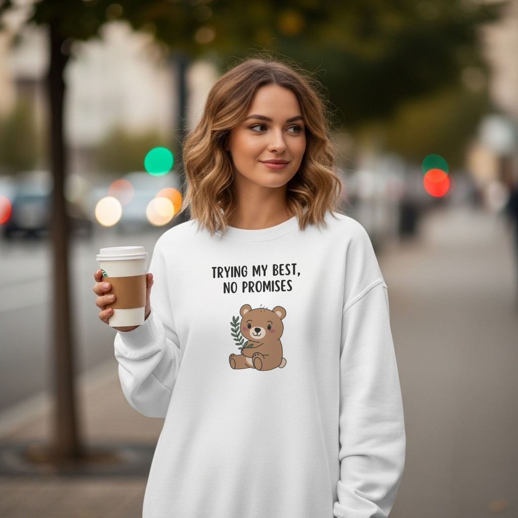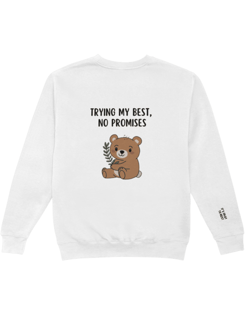 A playful yet relatable statement for those who give their all but won’t stress over perfection. This cozy white sweatshirt is perfect for laid-back days, reminding you that progress matters more than perfection. Soft, stylish, and made for everyday wear.
