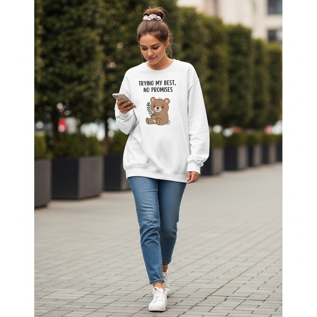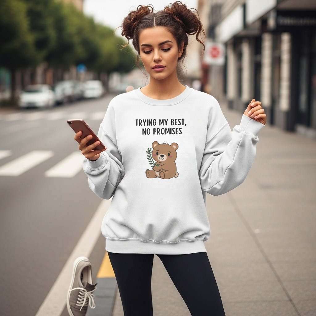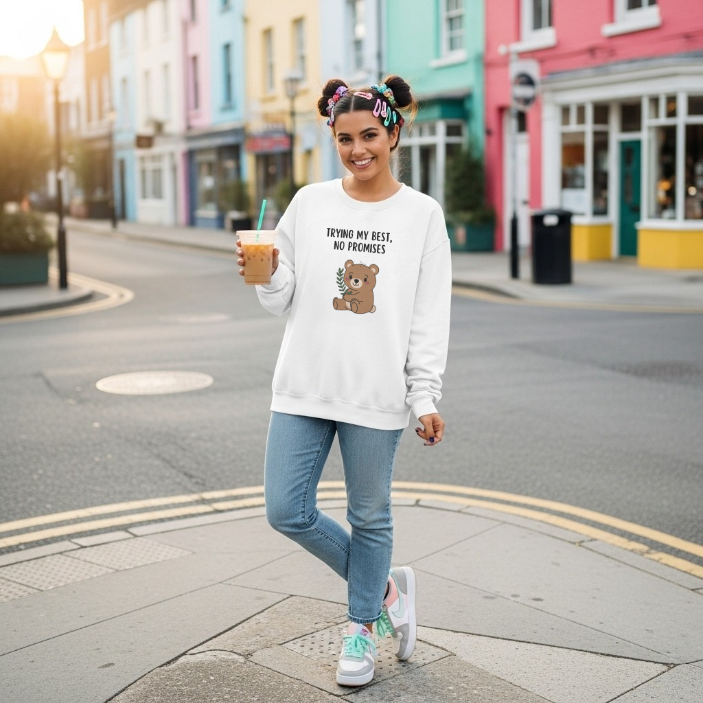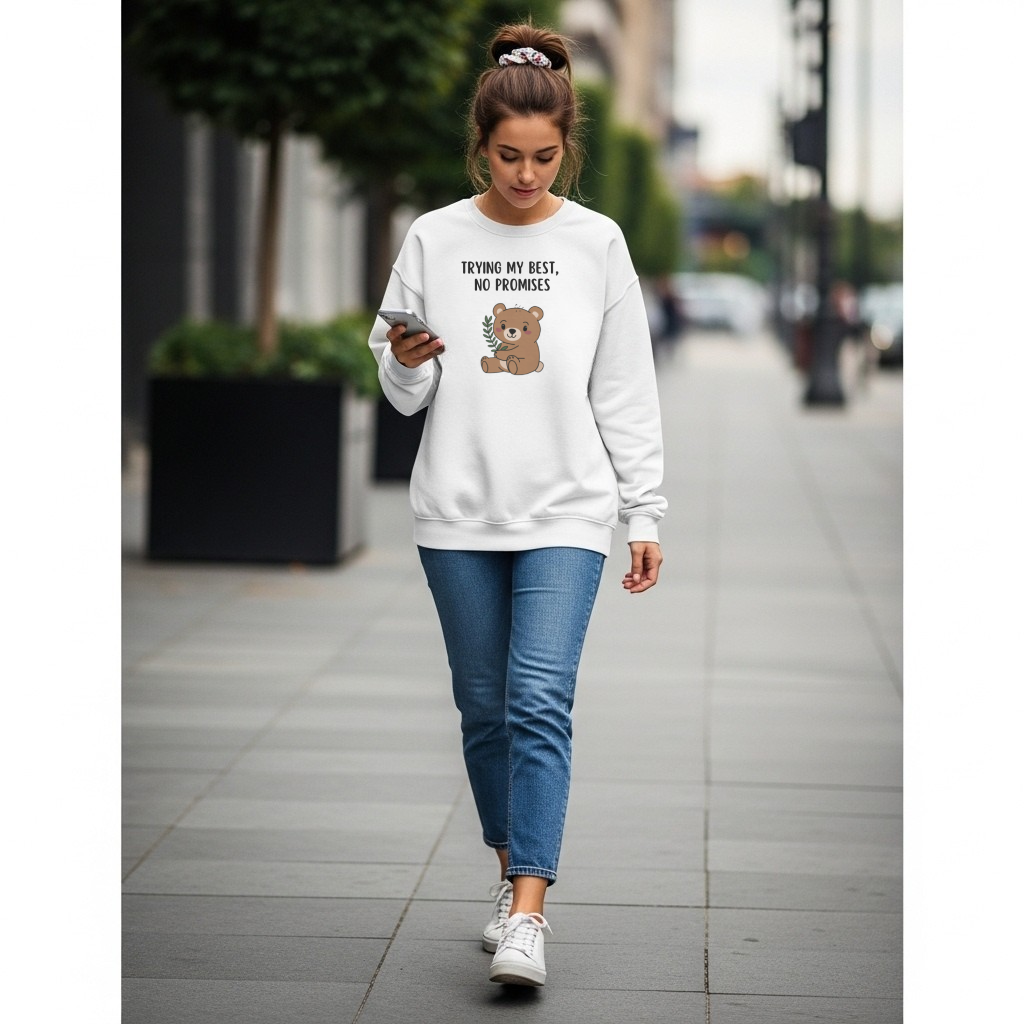 A playful yet relatable statement for those who give their all but won’t stress over perfection. This cozy white sweatshirt is perfect for laid-back days, reminding you that progress matters more than perfection. Soft, stylish, and made for everyday wear.